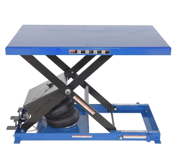 The pneumatic actuator is used in scissor lifts to elevate pallets, vehicles, or other items to an ergonomic working height, allowing operators to easily access materials.