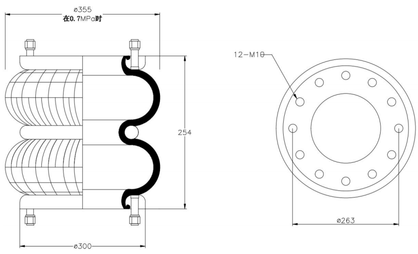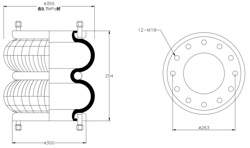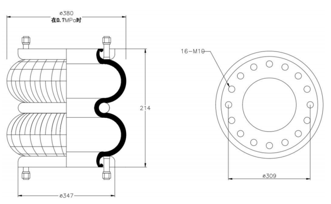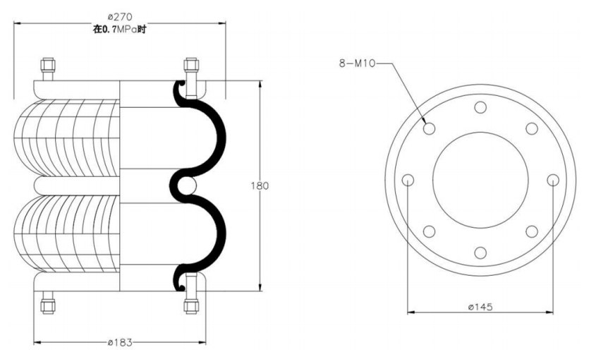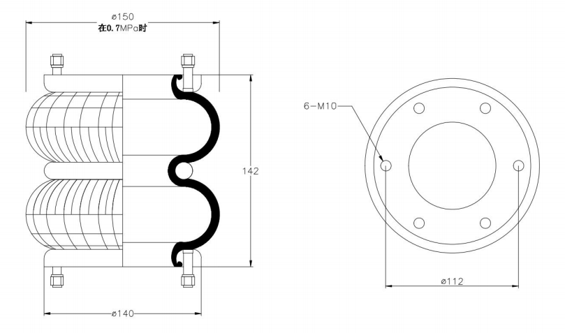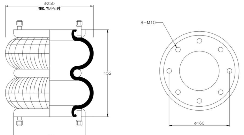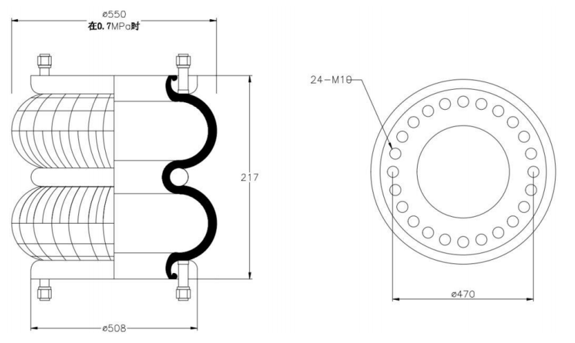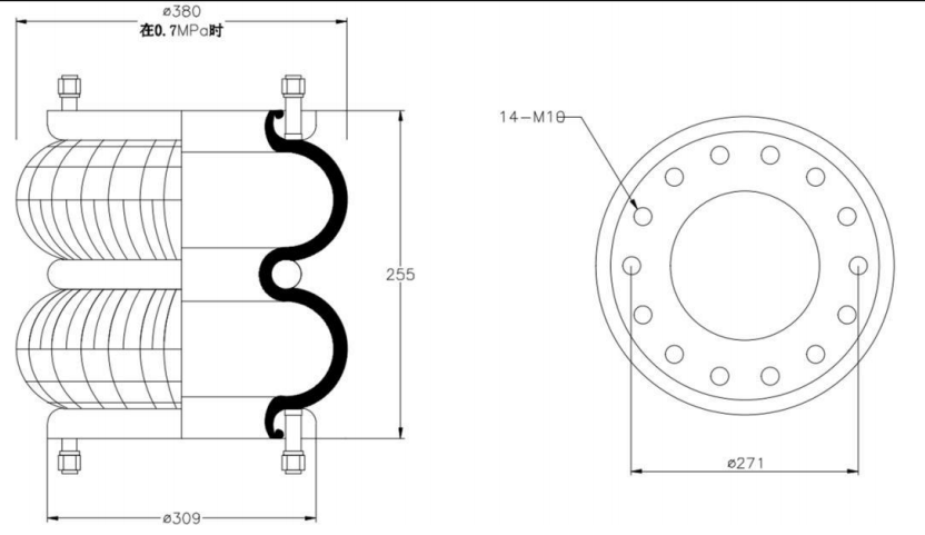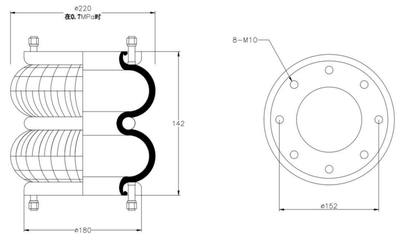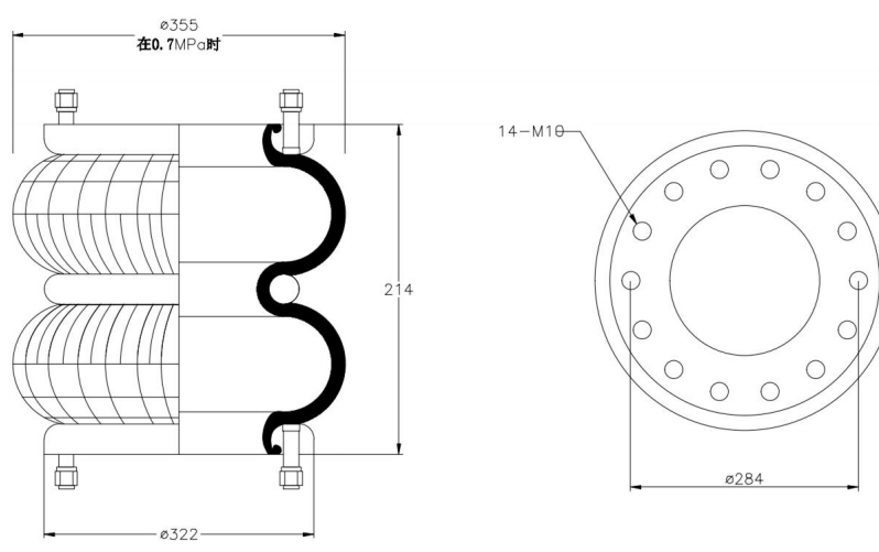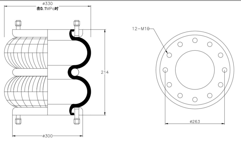 Do Not Use at a Pressure Exceeding 0.7 MPa: The air spring must be operated within the specified pressure limits to maintain optimal performance and safety. Exceeding a pressure of 0.7 MPa could lead to over-stretching of the air spring, compromising its structural integrity. Always check and regulate the air pressure according to the manufacturer’s recommendations.