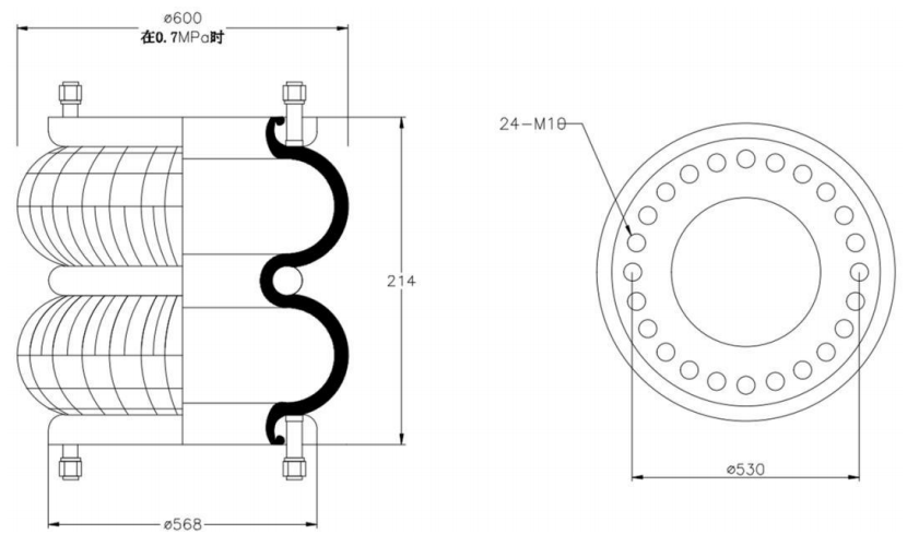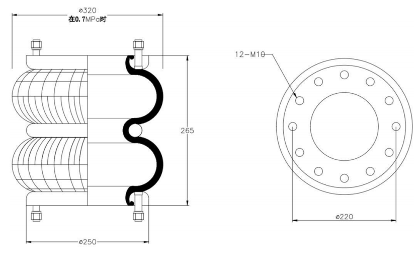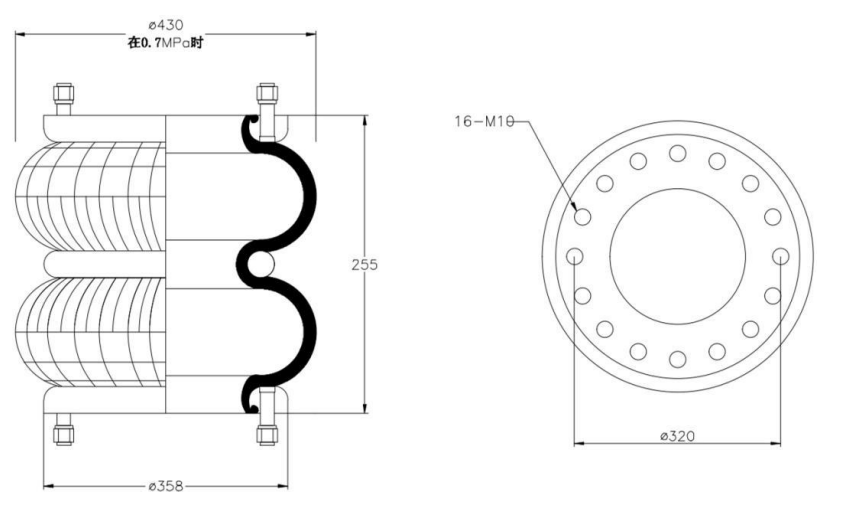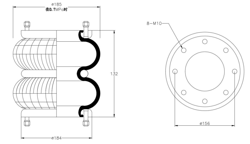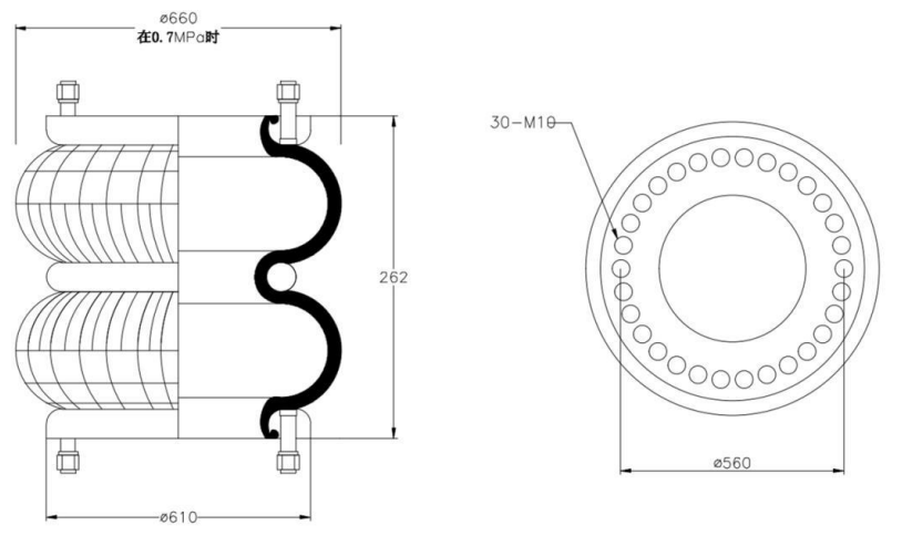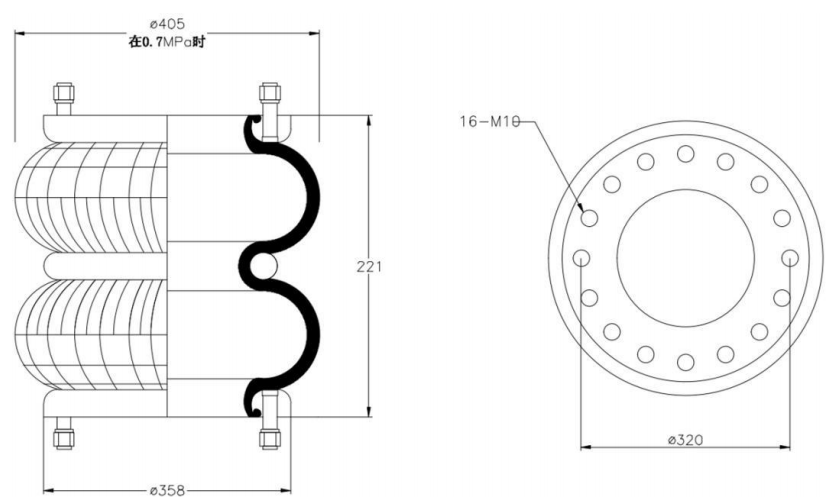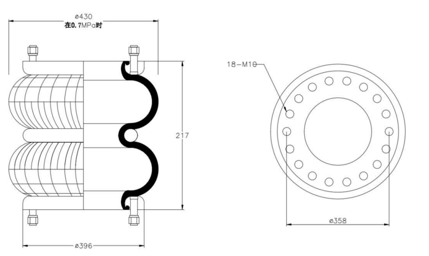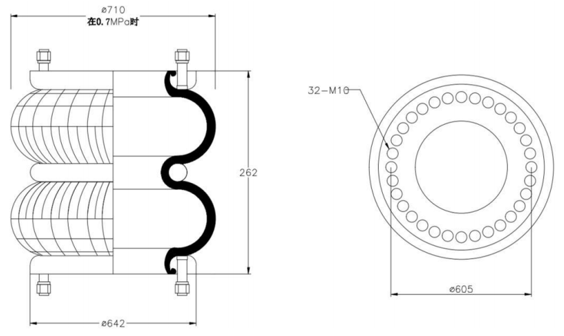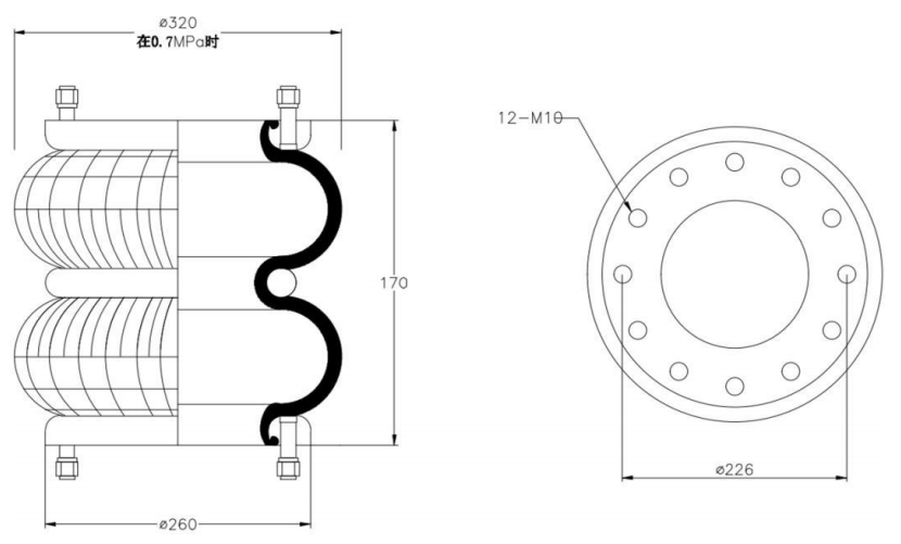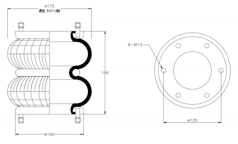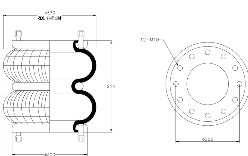 Do Not Use at a Pressure Exceeding 0.7 MPa: The air spring must be operated within the specified pressure limits to maintain optimal performance and safety. Exceeding a pressure of 0.7 MPa could lead to over-stretching of the air spring, compromising its structural integrity. Always check and regulate the air pressure according to the manufacturer’s recommendations.