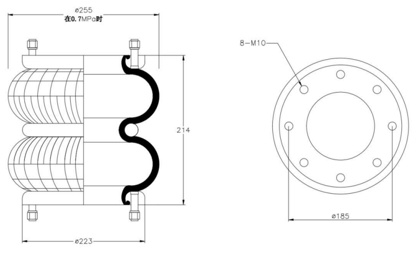 The FD-Type air spring functions by utilizing a rubber airbag that compresses and expands to absorb shocks and vibrations. As a load is applied, the internal air pressure adjusts to match the weight, enabling the air spring to maintain a steady height and efficiently isolate vibrations from external sources. Its design incorporates sealed end plates, eliminating the need for additional components and ensuring easy installation. This construction provides superior vibration dampening and impact absorption, improving comfort and safety. These air springs are ideal for use in various machinery and vehicles, delivering reliable performance in diverse applications.