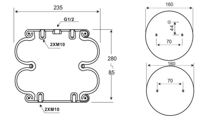 The FP-Type air spring functions by utilizing a rubber airbag that compresses and expands to absorb shocks and vibrations. As a load is applied, the internal air pressure adjusts to match the weight, enabling the air spring to maintain a steady height and efficiently isolate vibrations from external sources. Its design incorporates sealed end plates, eliminating the need for additional components and ensuring easy installation. This construction provides superior vibration dampening and impact absorption, improving comfort and safety. These air springs are ideal for use in various machinery and vehicles, delivering reliable performance in diverse applications.