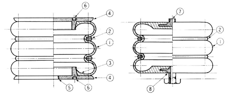 The ZS Series Self-Sealing Bellow-type Air Springs are named “bellow-type” due to their bellows-like (accordion) shape. Bellow-type air springs are generally divided into self-sealing and closed types. The rubber air bag ①, reinforced with fiber layers, is fitted with a low-carbon steel (galvanized) collar ② to prevent expansion. Under internal air pressure, the rubber air bag deforms, and to prevent air leakage, steel wire rings ③ and the top and bottom panels (galvanized) ④ make close contact. The top and bottom panels are available in both machined and stamped types, which can be selected based on the application (refer to tables 2 and 3). ⑤ is the threaded part for air piping, and ⑥ is the threaded hole for installation. Unlike the closed type, the self-sealing type has metal fittings ⑦ and ⑧ embedded in the rubber air bag at both ends, serving both as the air supply and for fixing purposes.